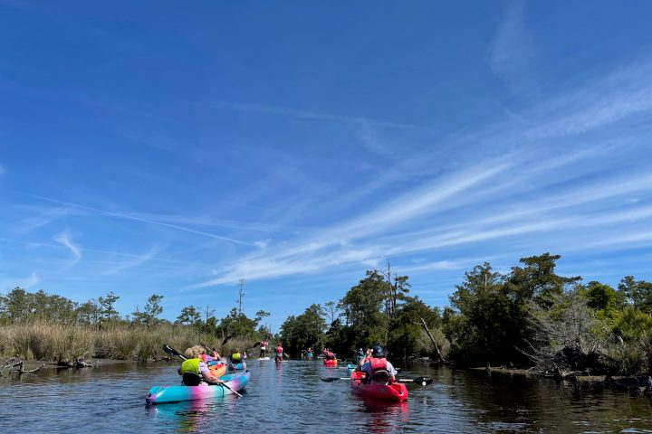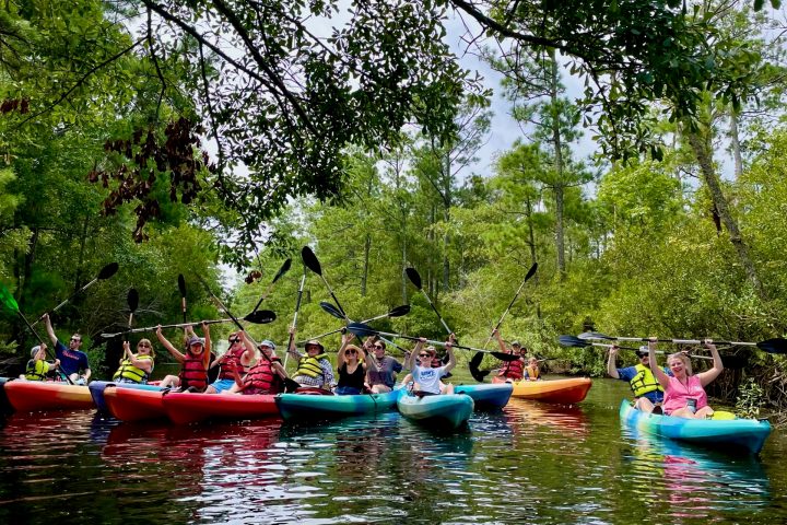 We explore the Kitty Hawk Maritime Forest by way of Ginguite Creek. The forest, a rare and endangered habitat, teems with diverse wildlife and fascinating native flora. During this extended and delightful Kitty Hawk kayak excursion, you may catch sight of an egret on the shore or a river otter gracefully navigating the creek. Geese, Osprey, Kingfishers, and magnificent Bald Eagles frequently grace the skies above our kayaks. As we paddle through the woods filled with pine, oak, and myrtle trees, you’ll often see turtles chilling on logs. This kayaking trip is perfect for anyone who loves being surrounded by nature’s beauty.